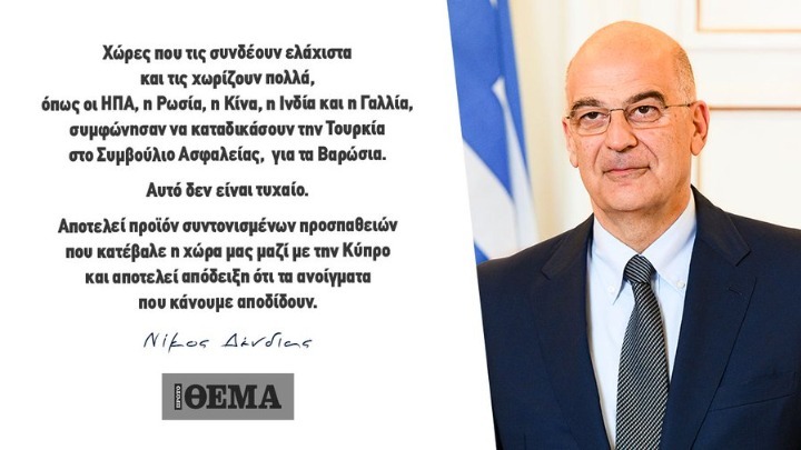 Αναφερόμενος στις τουρκικές εξαγγελίες για το άνοιγμα μέρους των Βαρωσίων, o Νίκος Δένδιας τονίζει πως δεν είναι απλώς μία ακόμα παράνομη ενέργεια της Τουρκίας η οποία καταπατεί και αγνοεί επιδεικτικά το Διεθνές Δίκαιο. Αποτελεί οργανωμένη προσπάθεια ριζικής αλλαγής του πλαισίου επίλυσης του Κυπριακού, υπογράμμισε.