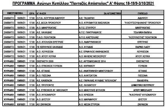 ΠΡΟΓΡΑΜΜΑ Αγώνων Κυπέλλου "Πανταζής Απόστολος" Α' Φάσης 18-19/9-3/10/2021
